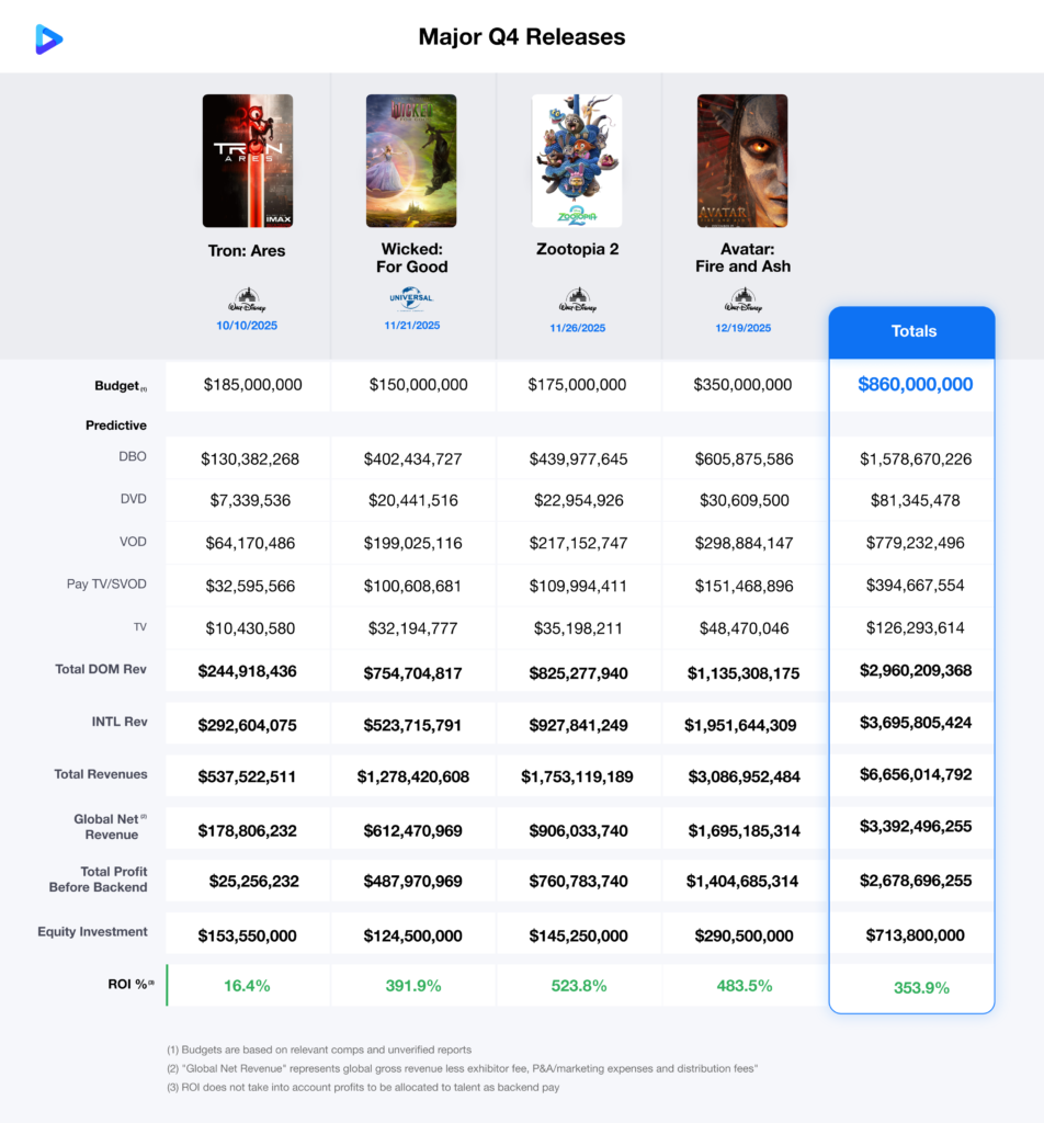 Last year’s Q4 was anchored by four major family-friendly releases—WICKED, MOANA 2, SONIC THE HEDGEHOG 3, and MUFASA: THE LION KING—all based on well-known IP. This year’s slate shifts slightly, with an equal balance of family-oriented titles with large-scale sci-fi action, each one a sequel: TRON: ARES, WICKED: FOR GOOD, ZOOTOPIA 2, and AVATAR: FIRE AND ASH.