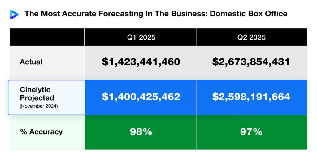 Over the course of this year, we’ve been tracking and revisiting the projections we made at the end of 2024 for the 2025 film slate. Now that the summer box office season has wrapped and the final stretch of releases lies ahead over the next three months, we’d like to share an update on our latest accuracy metrics.