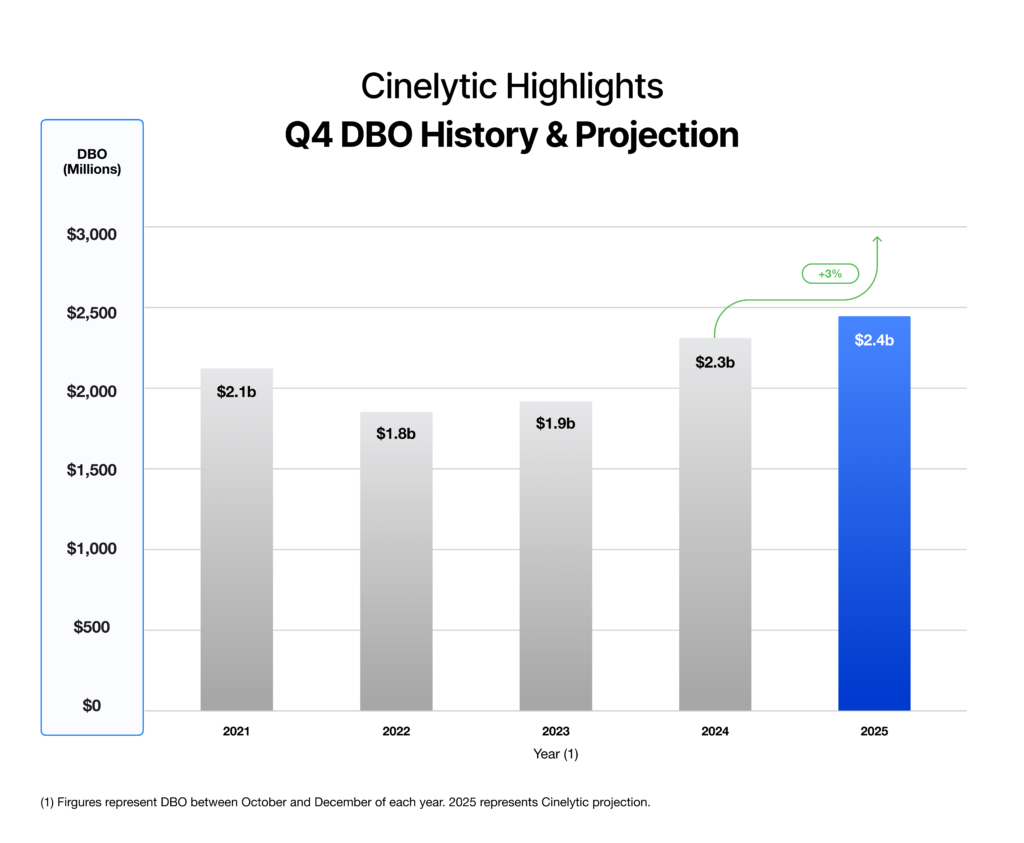 As illustrated in the graphic below, our projections call for a 3% increase in Q4 DBO over 2024, driven largely by a strong year-end showing from Walt Disney Studios. Later in these Insights, we highlight four key titles, each poised to leverage established intellectual property (IP) and the holiday season to extend the ongoing trend of franchise-driven success: