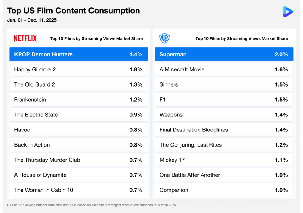 The summary graphic below suggests that WBD currently holds the edge in film performance. However, context matters. WBD has no remaining major film titles scheduled for digital release before the end of December. Netflix, by contrast, continues to benefit from occasional breakout films—event-level titles that can meaningfully outperform on an individual basis, as seen earlier this year with K-POP DEMON HUNTERS. That said, Netflix’s film performance has been less consistent across genres, while WBD’s broader slate strength and IP diversity have driven more reliable aggregate results, allowing WBD to maintain its current position in the rankings.