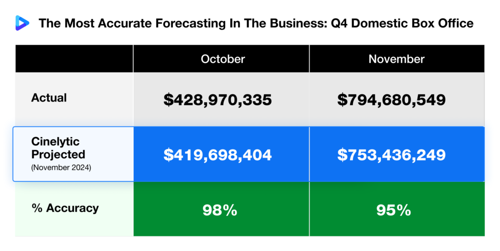 But before circling back to the broader Netflix vs. Warner Brothers Discovery (WBD) discussion, a quick update on something closer to home. As we enter the final stretch of the year, we wanted to share a brief update on our domestic forecasting accuracy so far in Q4, achieved through The Cinelytic Group’s predictive analytics platform, which projected the entire 2025 theatrical slate back in November 2024.