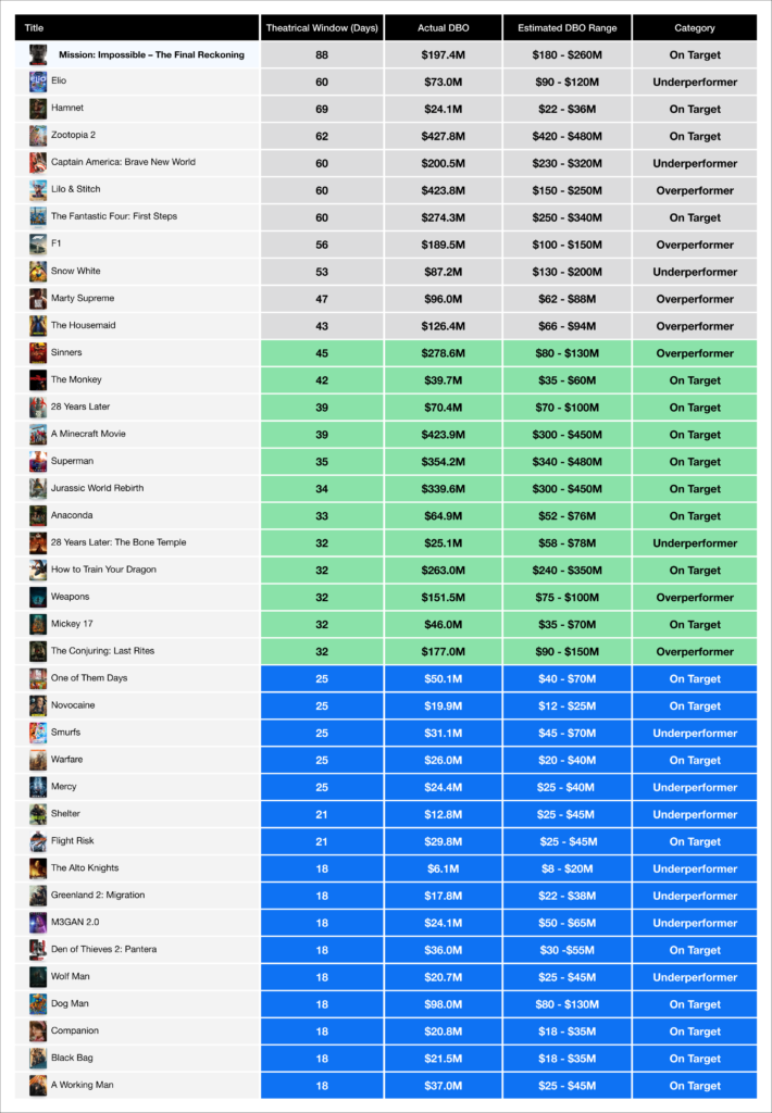 In October 2025, our team conducted an analysis of 30 films that received a theatrical release in 2025 and had completed at least their first week of digital availability. The findings were clear and consistent: films with theatrical exclusive windows of 26-to-45-day delivered the strongest streaming performance, and films that performed “on target” at the domestic box office relative to consensus industry projections also outperformed on streaming.